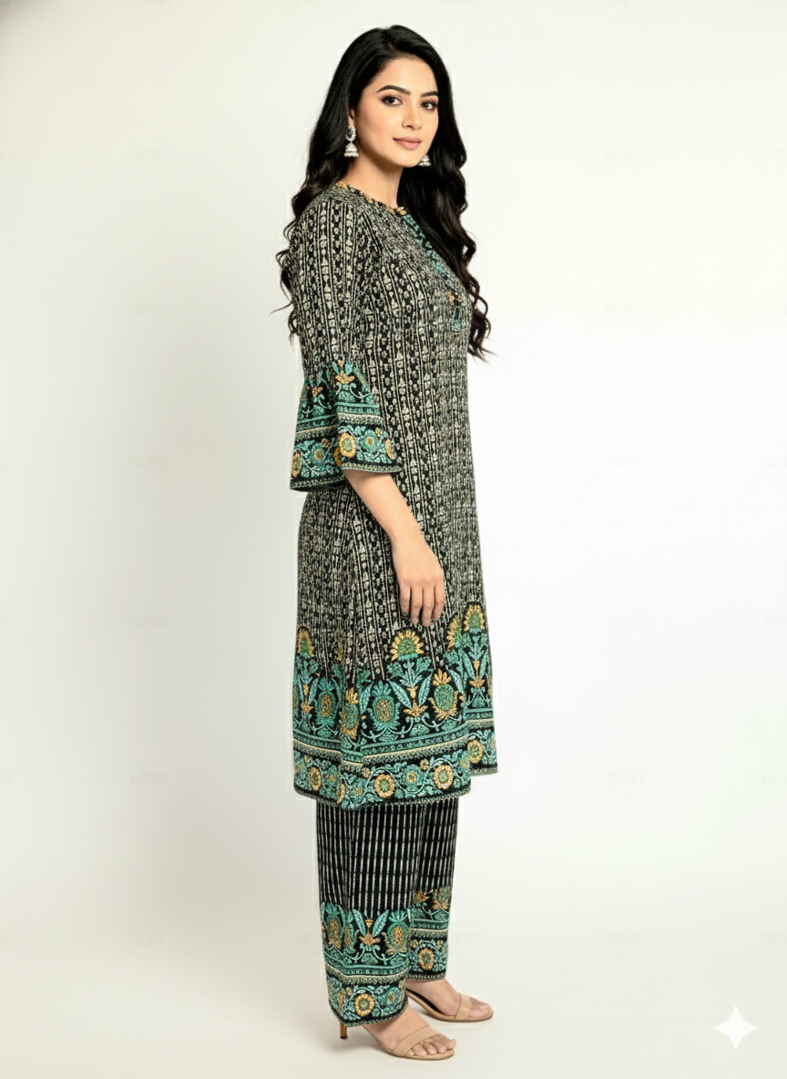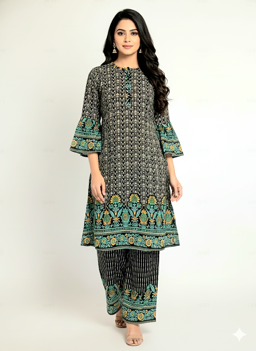 এই Ladies Two-Piece Co-ord Joypuri Set টি আধুনিক ডিজাইন ও আরামদায়ক ফিটের জন্য তৈরি।